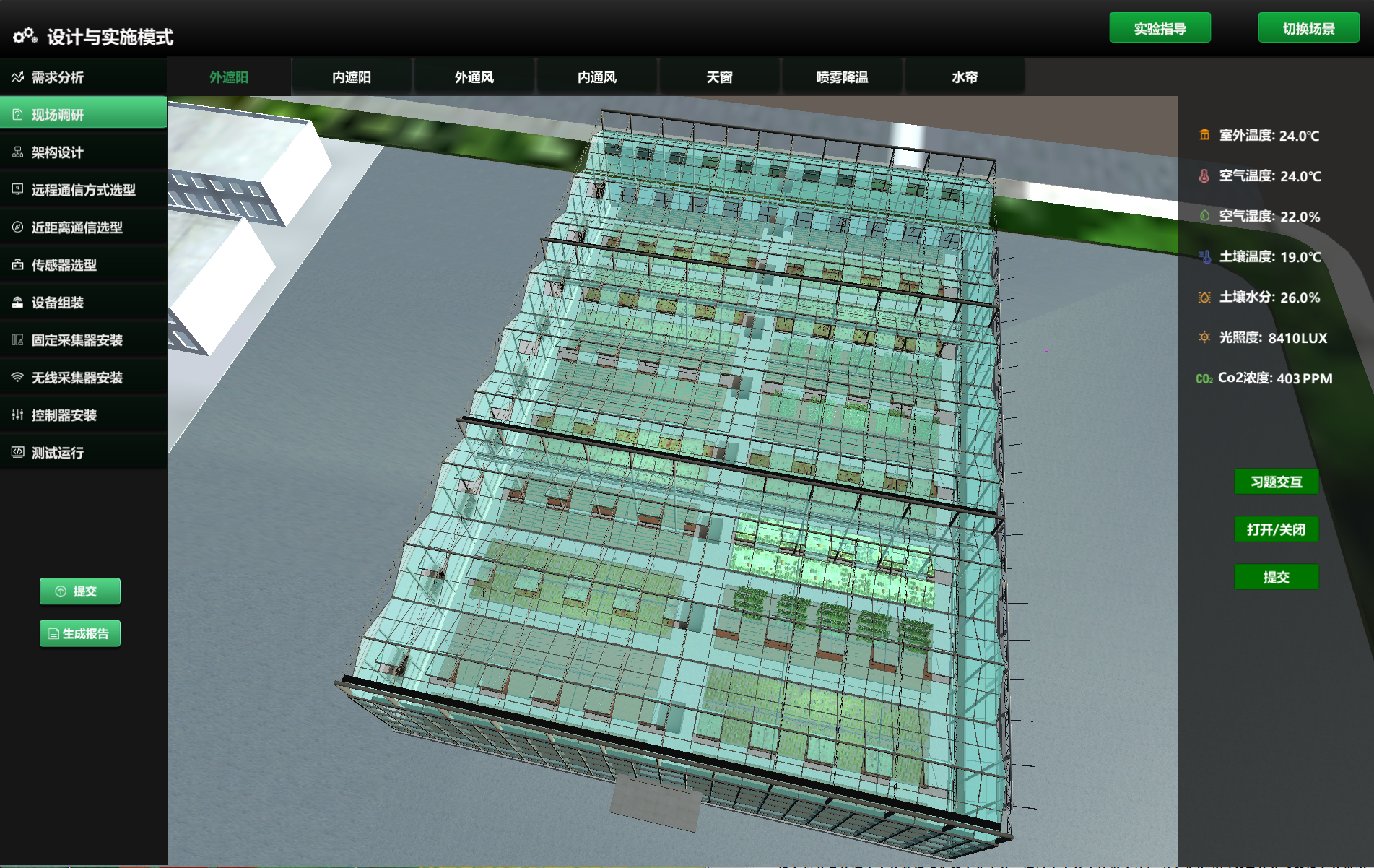 现场调研是以第三人称视角来近距离观看农业物联网执行器设备的开关,同时能够看清执行器设备转态的改变对传感器设备的影响。右菜单栏有习题交互,可以让学生了解智能农业3D物联网执行器的作用。