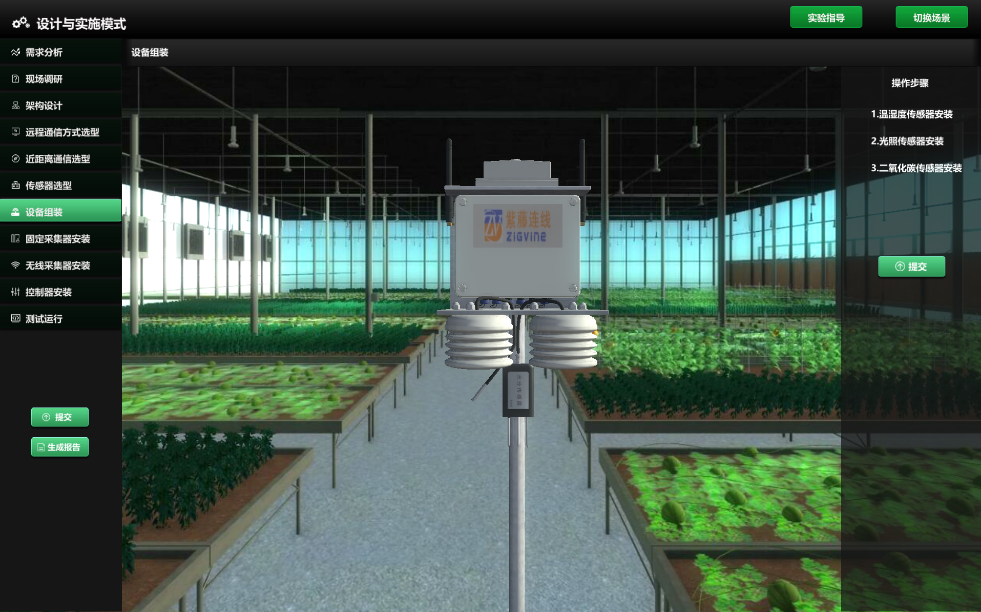 设备组装是按照真实的数据采集器来仿真的,通过虚实结合让学生认识到农业物联网所需的传感器设备的类型。